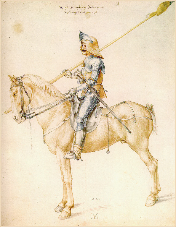 Wir bieten Ihnen eine handgefertigte Reproduktion auf Leinwand des berühmten Kunstwerks 'Ritter zu Pferd' von Albrecht Durer, aus dem Reproduktionsmuseum.