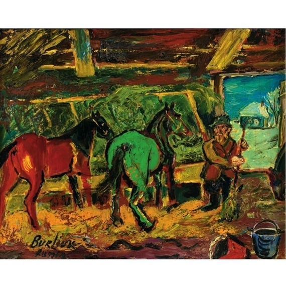 Die Verwendung lebendiger Farben und dynamischer Pinselstriche in Rote und grüne Pferde in einem Stall schafft eine lebendige Atmosphäre, die jeden Raum bereichert. Das Gemälde zieht den Betrachter in seinen Bann und lässt ihn die Leidenschaft und Energie der Pferde spüren. Ob in Ihrem Wohnzimmer, Büro oder einer Kunstsammlung, dieses Meisterwerk von David Burliuk wird zweifellos eine inspirierende und eindrucksvolle Wirkung auf die Atmosphäre Ihres Raums haben.