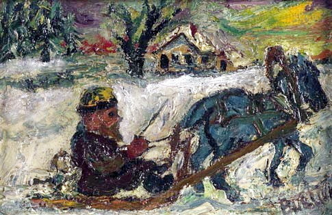 Wir bieten Ihnen eine handgefertigte Reproduktion auf Leinwand des berühmten Kunstwerks 'Russische Mann auf Schlitten durch Pferd gezogen' von David Burliuk, aus dem Reproduktionsmuseum.