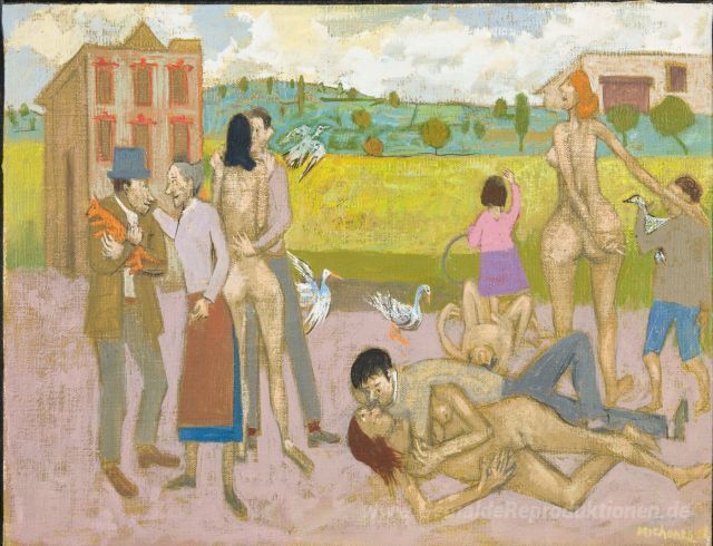 Wir bieten Ihnen eine handgefertigte Reproduktion auf Leinwand des berühmten Kunstwerks 'Scene de village' von Grégoire Michonze, aus dem Reproduktionsmuseum.
