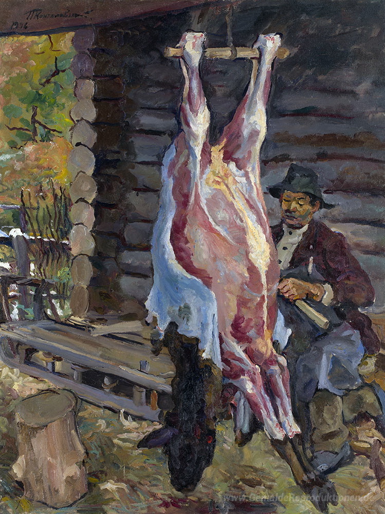 Wir bieten Ihnen eine handgefertigte Reproduktion auf Leinwand des berühmten Kunstwerks 'Schlachtkörper von Kalb' von Pyotr Konchalovsky, aus dem Reproduktionsmuseum.
