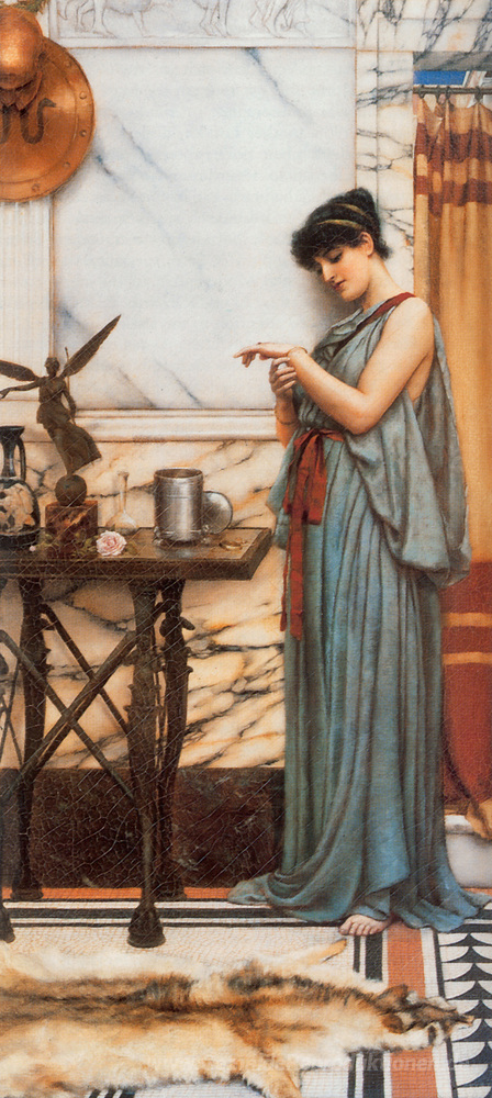 Wir bieten Ihnen eine handgefertigte Reproduktion auf Leinwand des berühmten Kunstwerks 'Seine Geburtstags-Geschenk' von John William Godward, aus dem Reproduktionsmuseum.