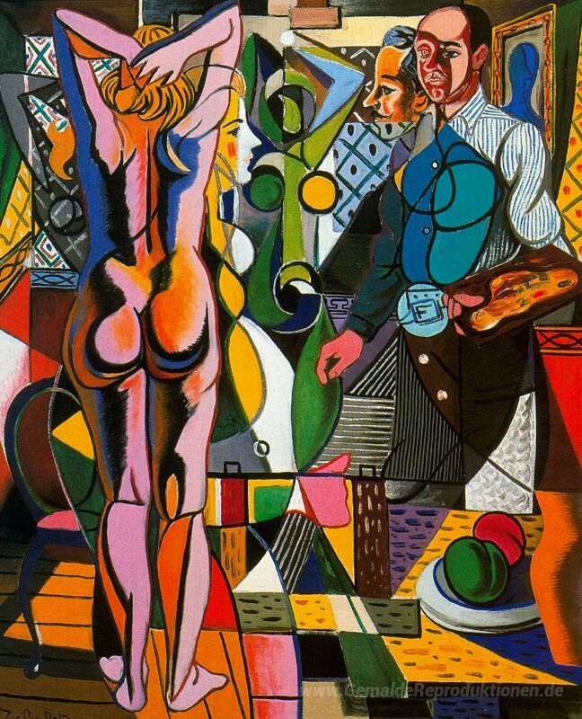 Wir bieten Ihnen eine handgefertigte Reproduktion auf Leinwand des berühmten Kunstwerks 'Selbstbildnis mit Modell und das Stillleben' von Rafael Zabaleta, aus dem Reproduktionsmuseum.