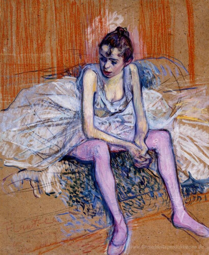 Wir bieten Ihnen eine handgefertigte Reproduktion auf Leinwand des berühmten Kunstwerks 'Sitzende Tänzerin in rosa Strumpfhosen' von Henri de Toulouse-Lautrec, aus dem Reproduktionsmuseum.
