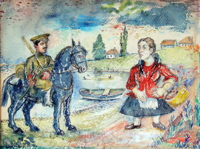 Wir bieten Ihnen eine handgefertigte Reproduktion auf Leinwand des berühmten Kunstwerks 'Soldat zu Pferd' von David Burliuk, aus dem Reproduktionsmuseum.