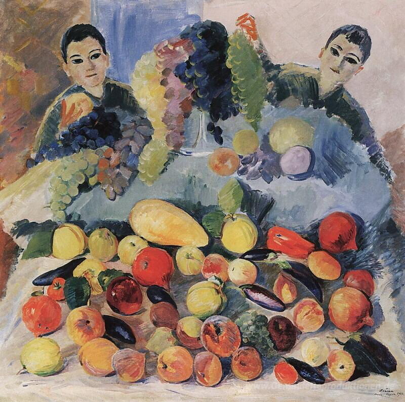Wir bieten Ihnen eine handgefertigte Reproduktion auf Leinwand des berühmten Kunstwerks 'Stillleben und Kinder' von Martiros Saryan, aus dem Reproduktionsmuseum.