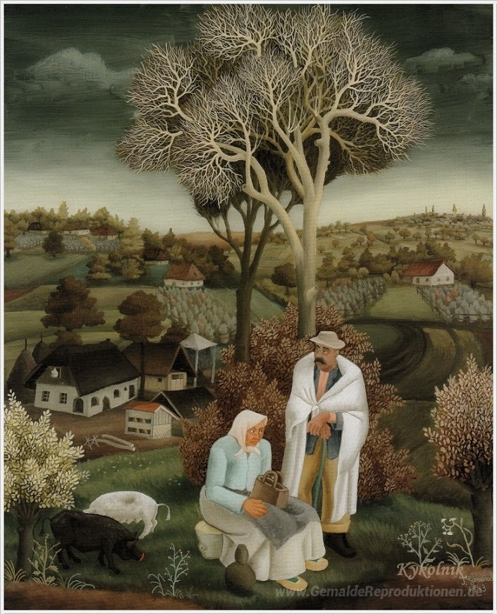 Wir bieten Ihnen eine handgefertigte Reproduktion auf Leinwand des berühmten Kunstwerks 'Stillstehen unter dem Baum' von Ivan Generalic, aus dem Reproduktionsmuseum.