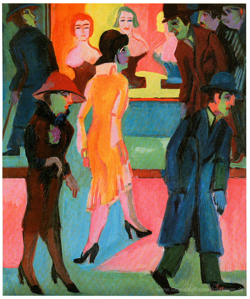 Wir bieten Ihnen eine handgefertigte Reproduktion auf Leinwand des berühmten Kunstwerks 'Straßenszene vor einem Barbershop' von Ernst Ludwig Kirchner, aus dem Reproduktionsmuseum.
