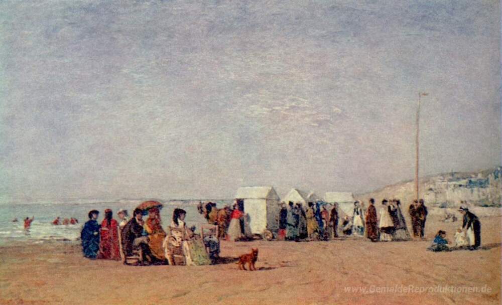 Wir bieten Ihnen eine handgefertigte Reproduktion auf Leinwand des berühmten Kunstwerks 'Strand in Trouville' von Eugene Boudin, aus dem Reproduktionsmuseum.