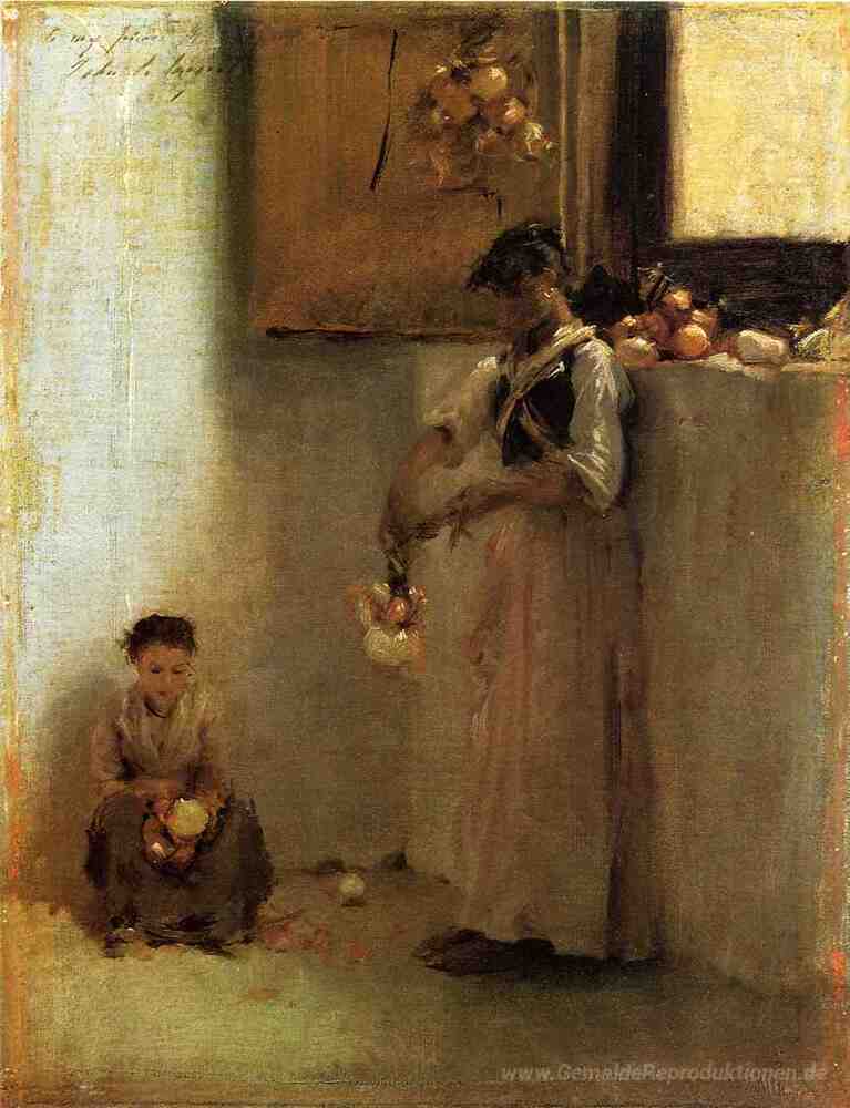 Wir bieten Ihnen eine handgefertigte Reproduktion auf Leinwand des berühmten Kunstwerks 'Stringing Onions' von John Singer Sargent, aus dem Reproduktionsmuseum.