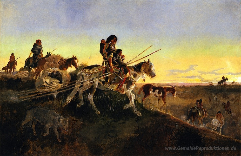 Wir bieten Ihnen eine handgefertigte Reproduktion auf Leinwand des berühmten Kunstwerks 'Suche nach neuen Jagdrevier' von Charles M. Russell, aus dem Reproduktionsmuseum.
