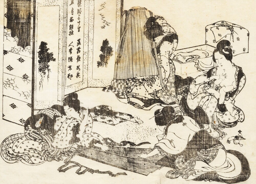 Wir bieten Ihnen eine handgefertigte Reproduktion auf Leinwand des berühmten Kunstwerks 'Szene der Hauswirtschaft. Vier Frauen arbeiten' von Katsushika Hokusai, aus dem Reproduktionsmuseum.