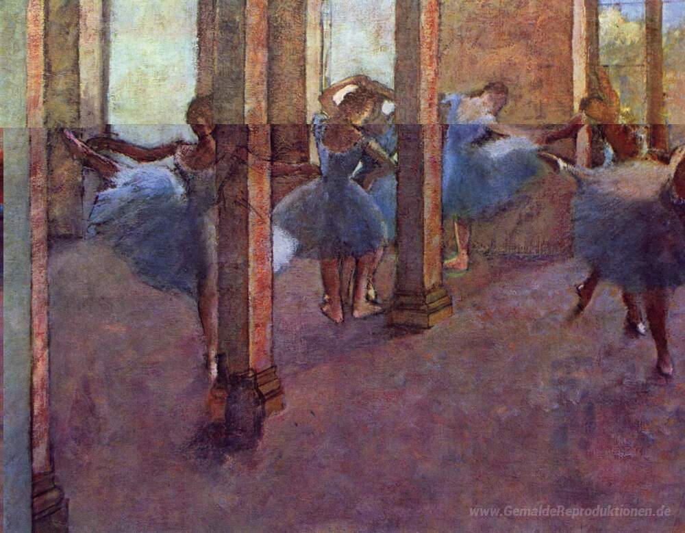 Wir bieten Ihnen eine handgefertigte Reproduktion auf Leinwand des berühmten Kunstwerks 'Tänzer im Foyer' von Edgar Degas, aus dem Reproduktionsmuseum.