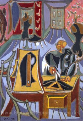 Wir bieten Ihnen eine handgefertigte Reproduktion auf Leinwand des berühmten Kunstwerks 'Tailor III' von Nikos Hadjikyriakos-Ghikas, aus dem Reproduktionsmuseum.