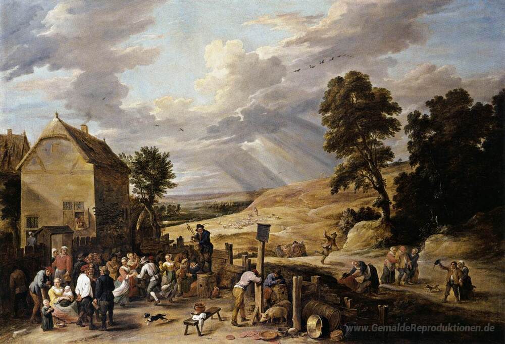Wir bieten Ihnen eine handgefertigte Reproduktion auf Leinwand des berühmten Kunstwerks 'Tanzende Bauern vor einem Gasthaus' von David Teniers the Younger, aus dem Reproduktionsmuseum.