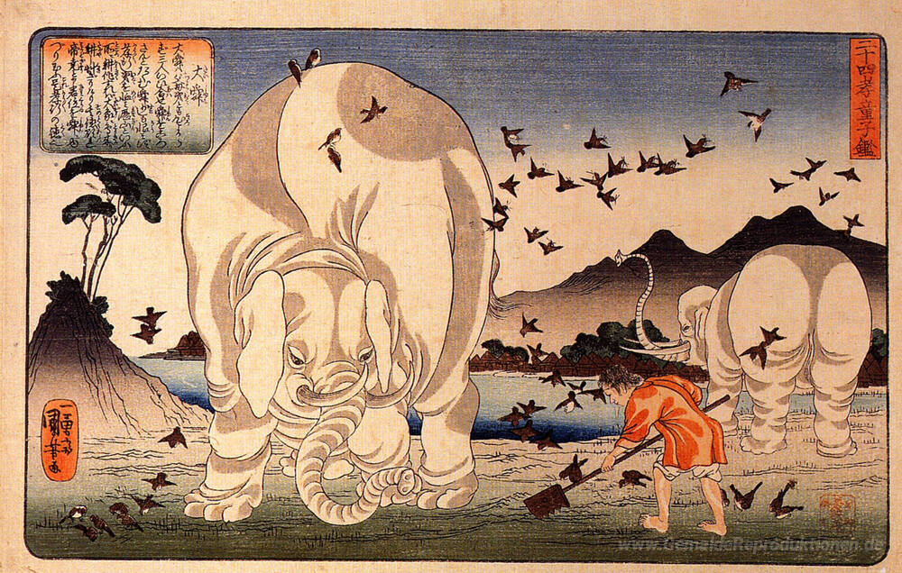Wir bieten Ihnen eine handgefertigte Reproduktion auf Leinwand des berühmten Kunstwerks 'Thaishun mit Elefanten' von Utagawa Kuniyoshi, aus dem Reproduktionsmuseum.