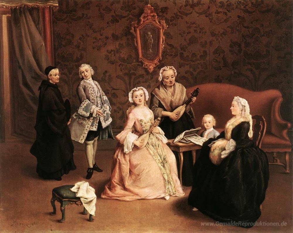 Wir bieten Ihnen eine handgefertigte Reproduktion auf Leinwand des berühmten Kunstwerks 'The Little Concert' von Pietro Longhi, aus dem Reproduktionsmuseum.