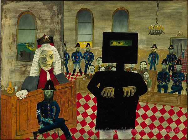 Wir bieten Ihnen eine handgefertigte Reproduktion auf Leinwand des berühmten Kunstwerks 'The Trial' von Sidney Nolan, aus dem Reproduktionsmuseum.