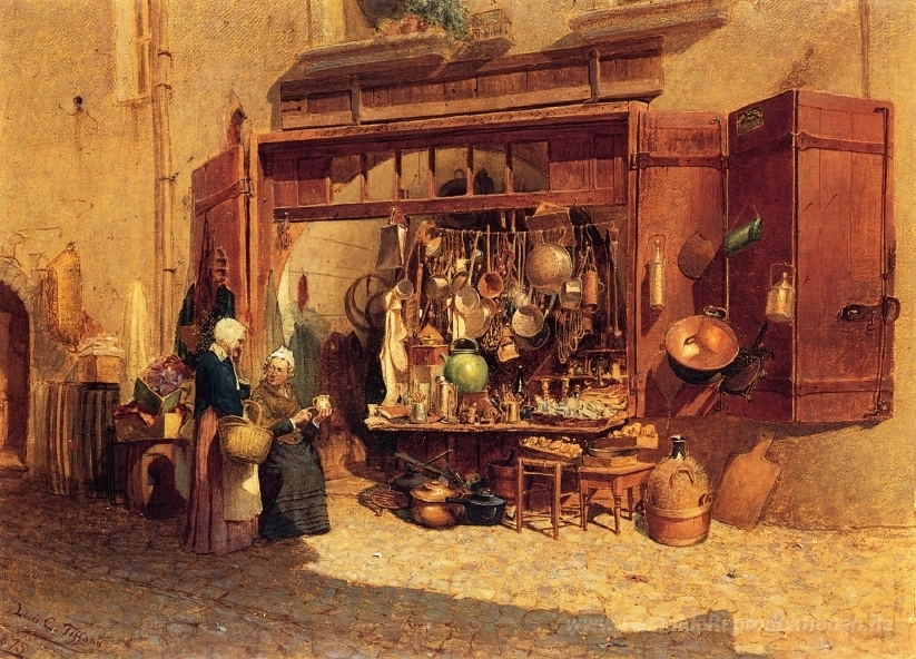 Wir bieten Ihnen eine handgefertigte Reproduktion auf Leinwand des berühmten Kunstwerks 'The Village Peddler' von Louis Comfort Tiffany, aus dem Reproduktionsmuseum.