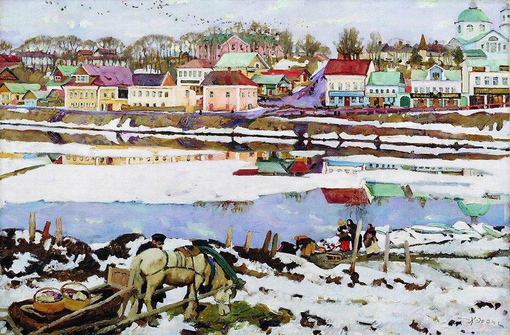 Wir bieten Ihnen eine handgefertigte Reproduktion auf Leinwand des berühmten Kunstwerks 'Torzhok' von Konstantin Yuon, aus dem Reproduktionsmuseum.