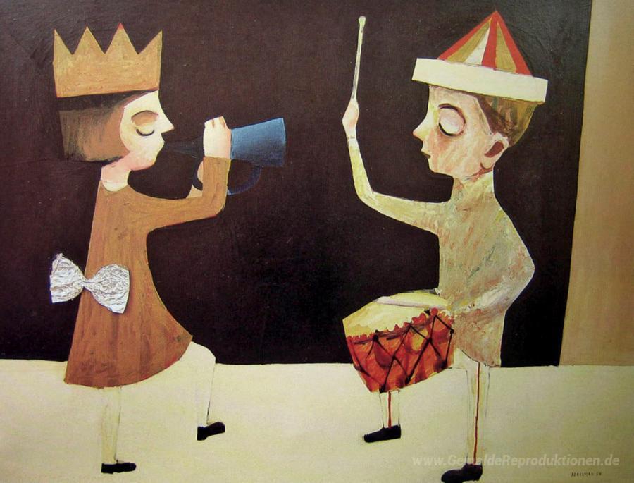 Wir bieten Ihnen eine handgefertigte Reproduktion auf Leinwand des berühmten Kunstwerks 'Trompeter und Schlagzeuger' von Charles Blackman, aus dem Reproduktionsmuseum.