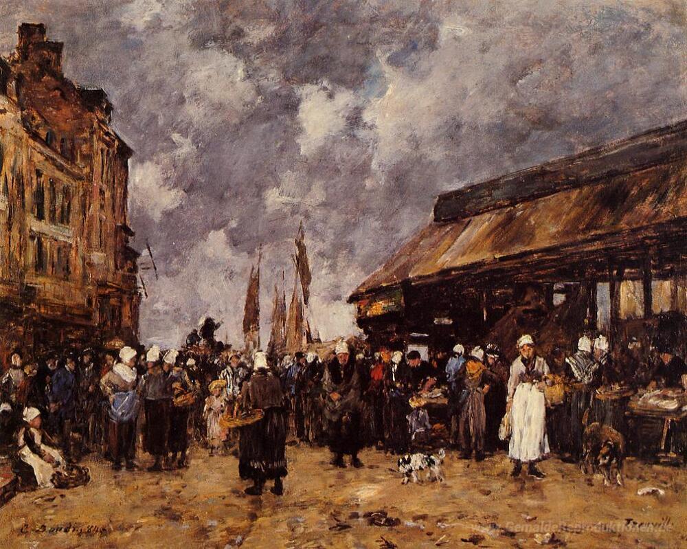 Wir bieten Ihnen eine handgefertigte Reproduktion auf Leinwand des berühmten Kunstwerks 'Trouville, der Fischmarkt' von Eugene Boudin, aus dem Reproduktionsmuseum.