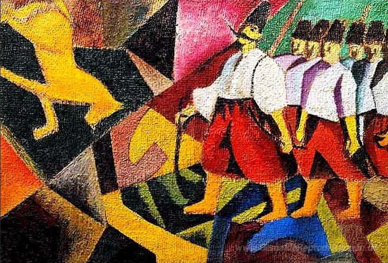 Wir bieten Ihnen eine handgefertigte Reproduktion auf Leinwand des berühmten Kunstwerks 'Ukrainer' von David Burliuk, aus dem Reproduktionsmuseum.