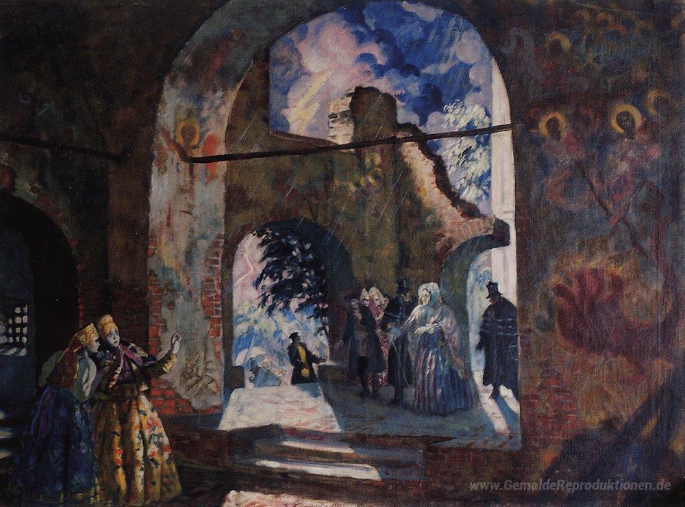 Wir bieten Ihnen eine handgefertigte Reproduktion auf Leinwand des berühmten Kunstwerks 'Unter den Arkaden der alten Kirche' von Boris Kustodiev, aus dem Reproduktionsmuseum.