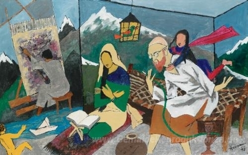 Wir bieten Ihnen eine handgefertigte Reproduktion auf Leinwand des berühmten Kunstwerks 'Untitled (Husain Familie)' von M.F. Husain, aus dem Reproduktionsmuseum.