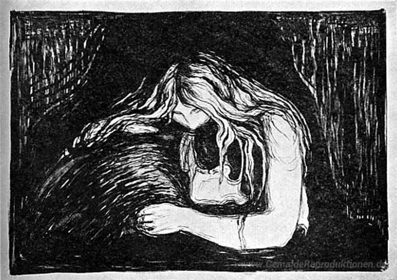 Wir bieten Ihnen eine handgefertigte Reproduktion auf Leinwand des berühmten Kunstwerks 'Vampire II' von Edvard Munch, aus dem Reproduktionsmuseum.