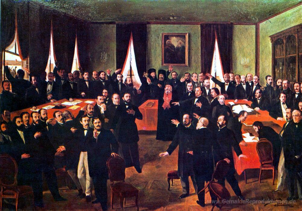Wir bieten Ihnen eine handgefertigte Reproduktion auf Leinwand des berühmten Kunstwerks 'Verkündigung der Union' von Theodor Aman, aus dem Reproduktionsmuseum.
