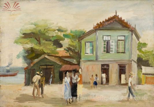 Wir bieten Ihnen eine handgefertigte Reproduktion auf Leinwand des berühmten Kunstwerks 'Vilarejo com Marinha' von Mario Zanini, aus dem Reproduktionsmuseum.