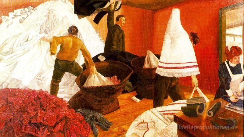 Wir bieten Ihnen eine handgefertigte Reproduktion auf Leinwand des berühmten Kunstwerks 'Wäsche sortieren' von Stanley Spencer, aus dem Reproduktionsmuseum.