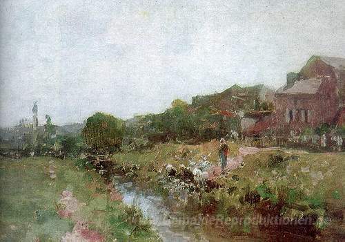 Wir bieten Ihnen eine handgefertigte Reproduktion auf Leinwand des berühmten Kunstwerks 'Wäscherin in der Bretagne' von Nicolae Grigorescu, aus dem Reproduktionsmuseum.