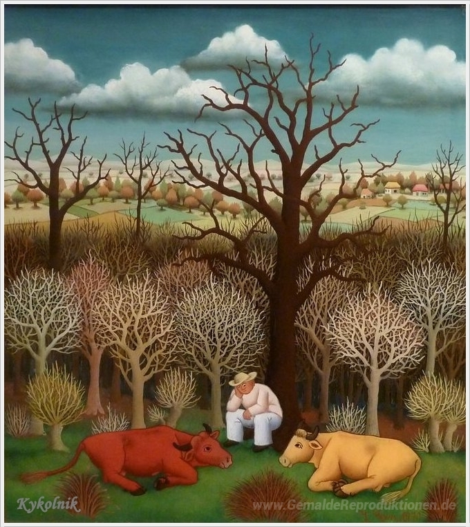 Wir bieten Ihnen eine handgefertigte Reproduktion auf Leinwand des berühmten Kunstwerks 'Wacht über zwei Kühe' von Ivan Generalic, aus dem Reproduktionsmuseum.