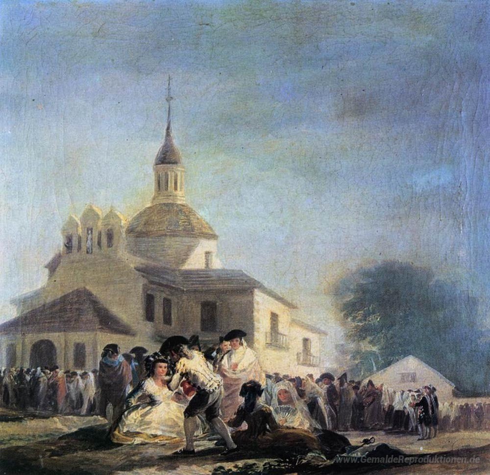 Wir bieten Ihnen eine handgefertigte Reproduktion auf Leinwand des berühmten Kunstwerks 'Wallfahrt zur Kirche von San Isidro' von Francisco Goya, aus dem Reproduktionsmuseum.