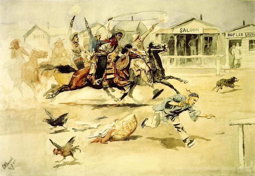 Wir bieten Ihnen eine handgefertigte Reproduktion auf Leinwand des berühmten Kunstwerks 'Whooping It Up' von Charles M. Russell, aus dem Reproduktionsmuseum.