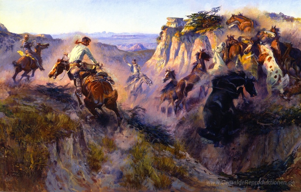 Wir bieten Ihnen eine handgefertigte Reproduktion auf Leinwand des berühmten Kunstwerks 'Wild Horse Jäger [No. 2]' von Charles M. Russell, aus dem Reproduktionsmuseum.