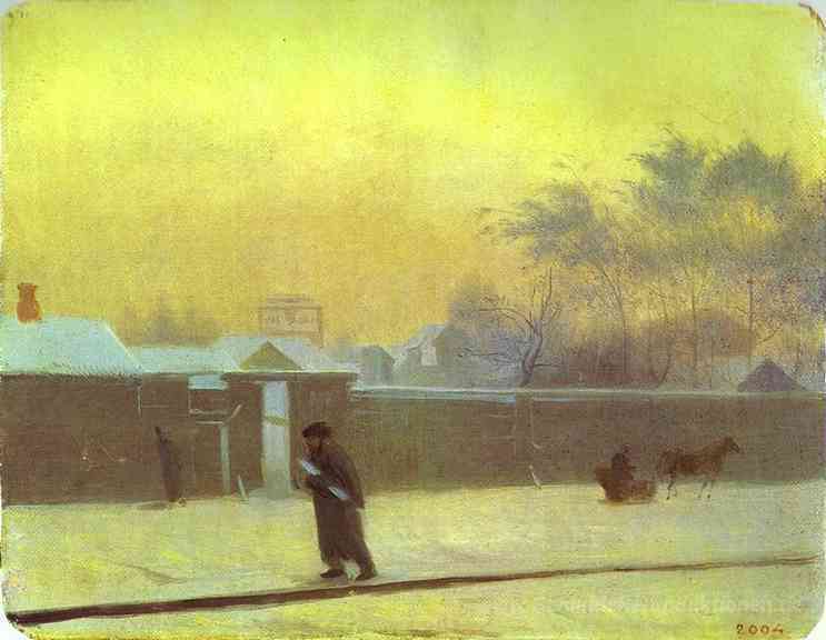 Wir bieten Ihnen eine handgefertigte Reproduktion auf Leinwand des berühmten Kunstwerks 'Winterliche Straße auf Wassili-Insel, St. Petersburg' von Pavel Fedotov, aus dem Reproduktionsmuseum.