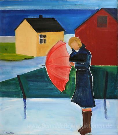 Wir bieten Ihnen eine handgefertigte Reproduktion auf Leinwand des berühmten Kunstwerks 'Woman in Reykjavik mit Regenschirm' von Louisa Matthiasdottir, aus dem Reproduktionsmuseum.