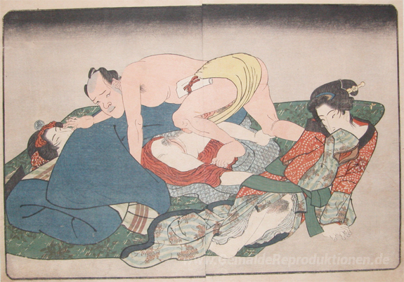 Wir bieten Ihnen eine handgefertigte Reproduktion auf Leinwand des berühmten Kunstwerks 'Yabai mit zwei Frauen' von Keisai Eisen, aus dem Reproduktionsmuseum.