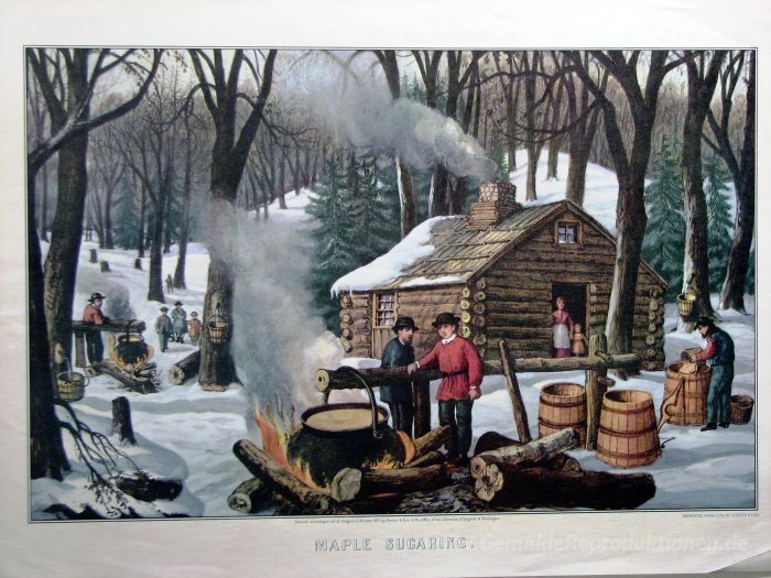 Wir bieten Ihnen eine handgefertigte Reproduktion auf Leinwand des berühmten Kunstwerks 'Zuckernder Ahorn' von Currier and Ives, aus dem Reproduktionsmuseum.