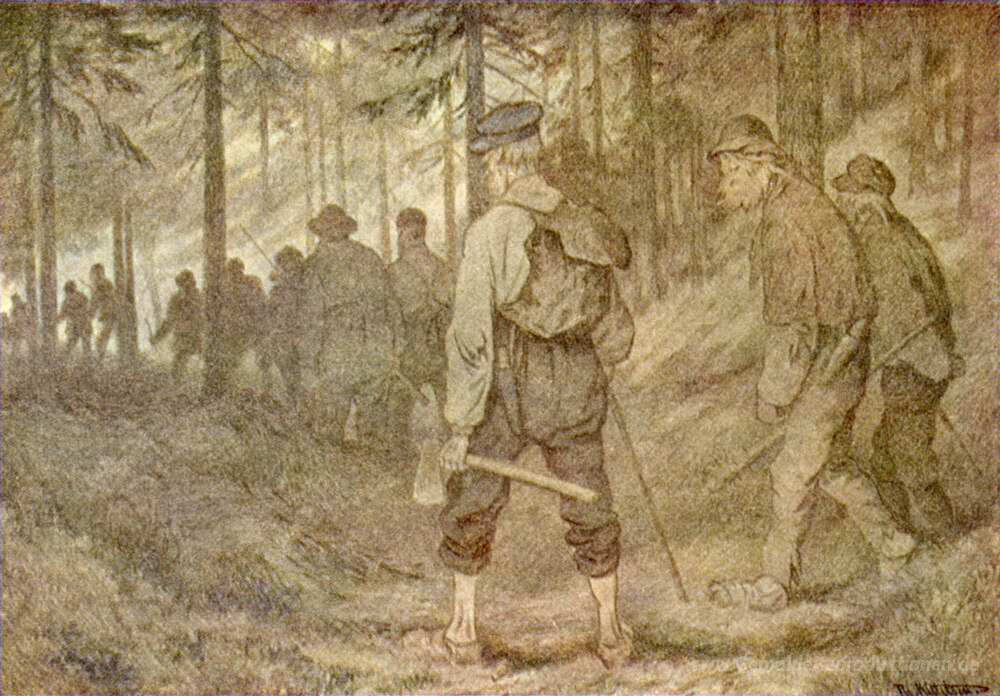 Wir bieten Ihnen eine handgefertigte Reproduktion auf Leinwand des berühmten Kunstwerks 'Zwölf Männer in den Wald' von Theodor Severin Kittelsen, aus dem Reproduktionsmuseum.