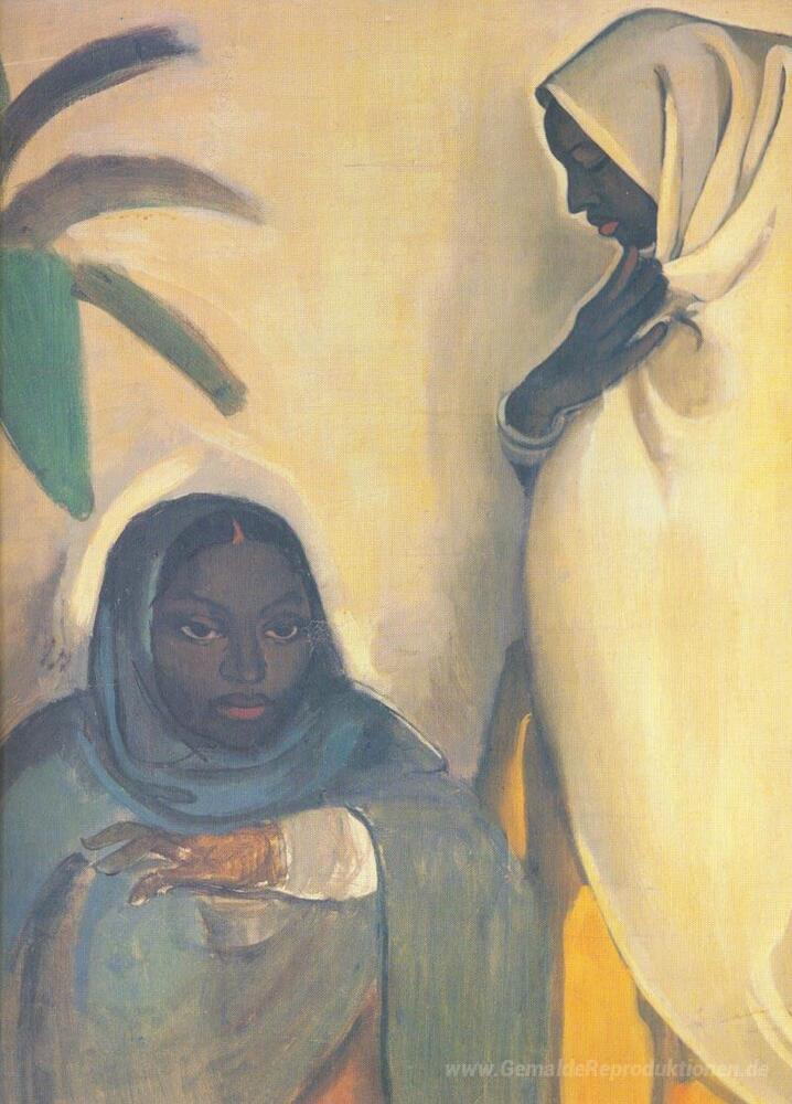 Wir bieten Ihnen eine handgefertigte Reproduktion auf Leinwand des berühmten Kunstwerks 'Zwei Frauen' von Amrita Sher-Gil, aus dem Reproduktionsmuseum.
