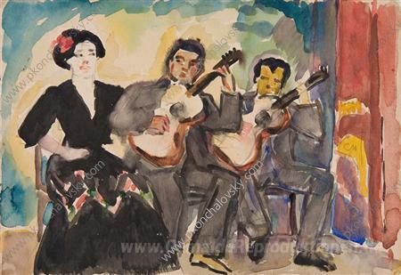 Wir bieten Ihnen eine handgefertigte Reproduktion auf Leinwand des berühmten Kunstwerks 'Zwei Gitarristen und Sänger' von Pyotr Konchalovsky, aus dem Reproduktionsmuseum.