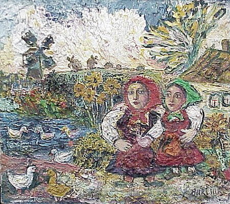 Wir bieten Ihnen eine handgefertigte Reproduktion auf Leinwand des berühmten Kunstwerks 'Zwei Mädchen in einem Hof mit Enten und einer Windmühle' von David Burliuk, aus dem Reproduktionsmuseum.