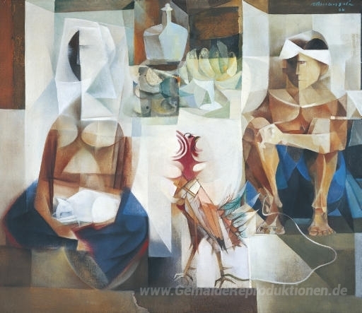 Das Gemälde Zwei Männer mit Hahn ist nicht nur ein visueller Genuss, sondern auch ein Gesprächsstoff. Es gelingt Manansala, durch seine innovative Komposition und das Spiel mit Licht und Schatten, die Betrachter in seinen Bann zu ziehen und ihnen einen Einblick in die kulturelle Vielfalt der Philippinen zu gewähren. Bereichern Sie Ihr Zuhause mit diesem ikonischen Kunstwerk und erleben Sie, wie es den Charakter und die Energie Ihres Raumes bereichert.