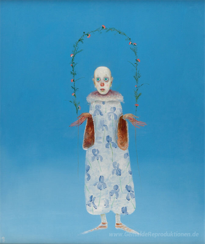 Wir bieten Ihnen eine handgefertigte Reproduktion auf Leinwand des berühmten Kunstwerks 'Zwerg mit roten Blumen' von Stefan Caltia, aus dem Reproduktionsmuseum.
