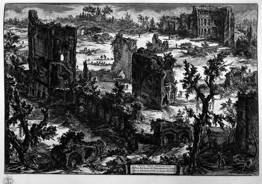 Wir bieten Ihnen eine handgefertigte Reproduktion auf Leinwand des berühmten Kunstwerks 'Blick auf die Thermen des Titus' von Giovanni Battista Piranesi, aus dem Reproduktionsmuseum.
