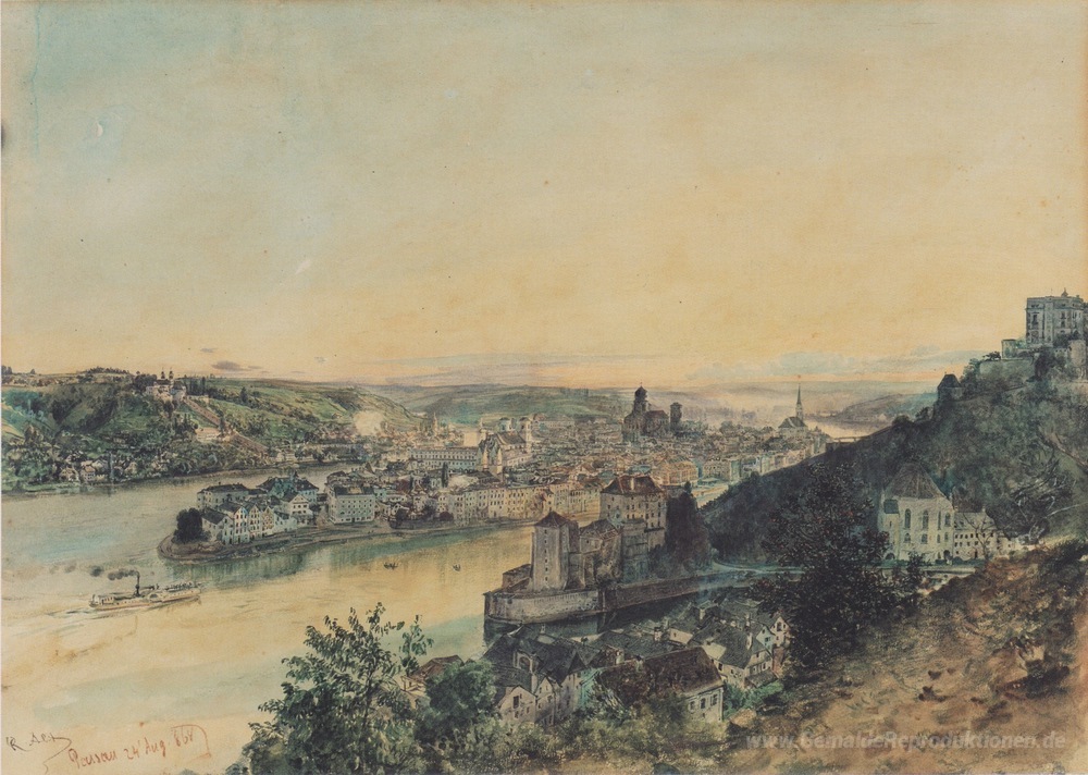 Wir bieten Ihnen eine handgefertigte Reproduktion auf Leinwand des berühmten Kunstwerks 'Blick auf Passau' von Rudolf von Alt, aus dem Reproduktionsmuseum.